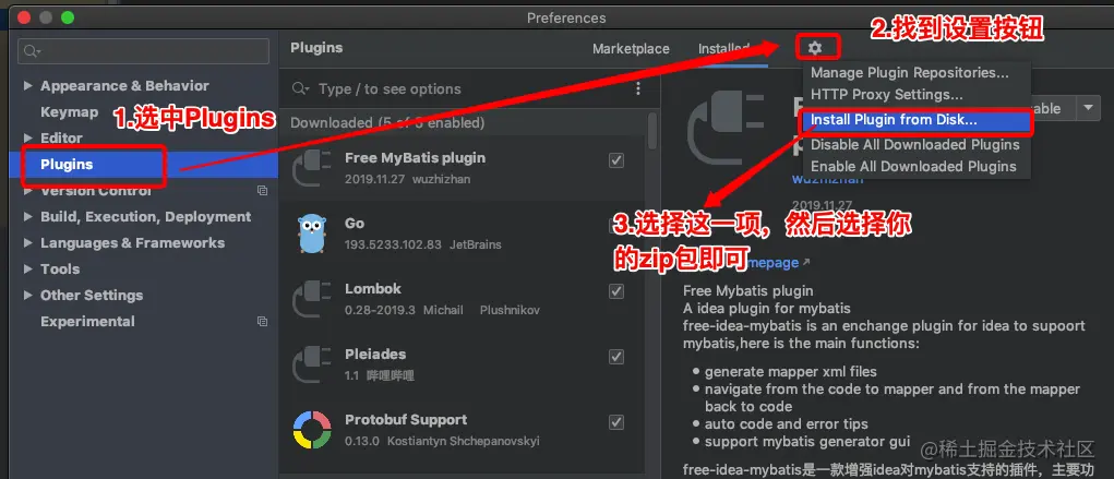 然后选择IDEA的Preferences下的plugins选项,弹出如下框,按照图里的指示选择zip包安装即可: