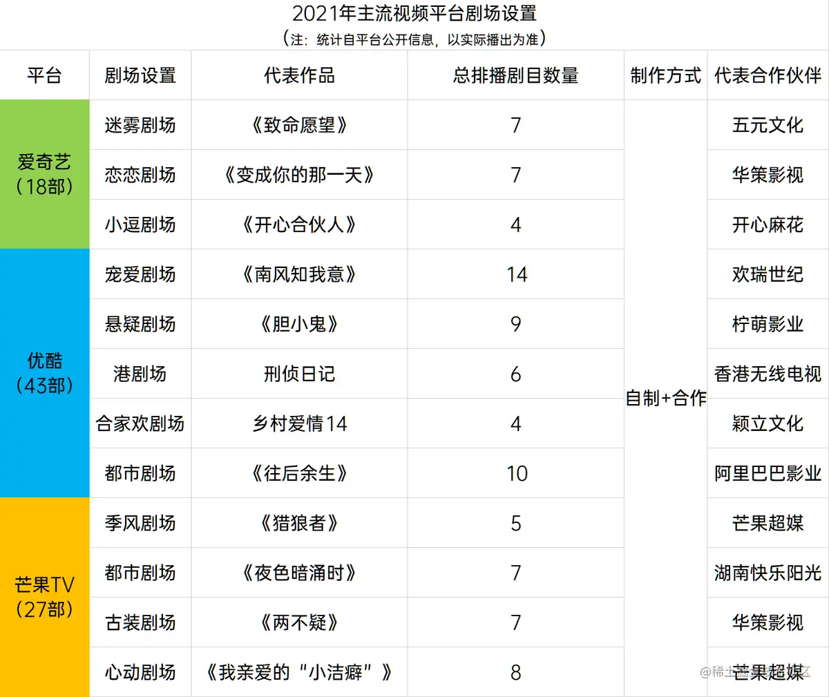 去年爱奇艺为迷雾剧场安排了六部悬疑剧,自身均为第一出品方。今年,爱奇艺、优酷、芒果TV给出的剧场片单里,各自的剧集数量分别高达18部、43部、27部。其中,超过80%的剧集为自制或联合制作。