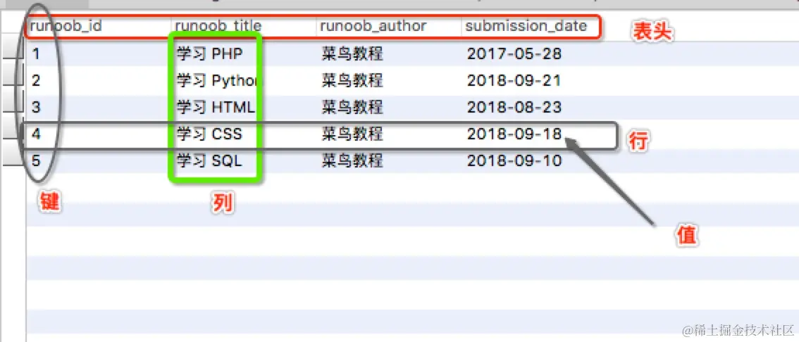 - 参照完整性: 参照的完整性要求关系中不允许引用不存在的实体。与实体完整性是关系模型必须满足的完整性约束条件,目的是保证数据的一致性。MySQL 为关系型数据库(Relational Database Management System), 这种所谓的"关系型"可以理解为"表格"的概念, 一个关系型数据库由一个或数个表格组成, 如图所示的一个表格: