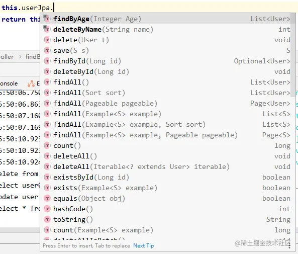 可以使用该jpa接口类中很多自定义的方法,比如:其中加粗字体的是我们在UserJpa中自己定义的方法。