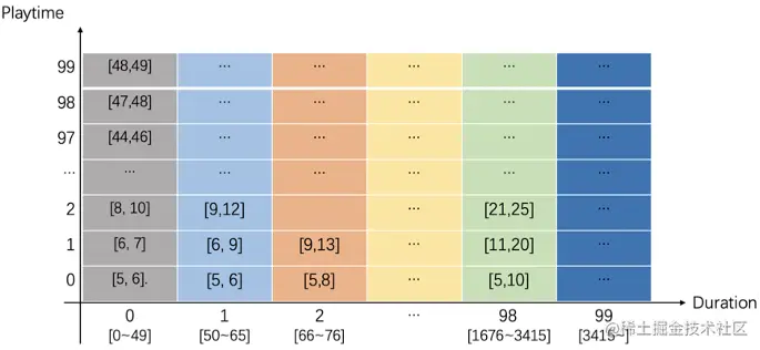 采用等频分桶的方式,对一定时间窗口内的播放样本按照duration(视频时长)排序分散到100个桶,确保同一桶中视频观看数相同。进一步地对每个duration桶按照playtime(播放时长)排序再次等频分散到100个桶,并将权重归一化到[0,99]的区间整数。因此对所有样本,均可按照(duration,playtime)确定固定的分桶坐标和权值。
