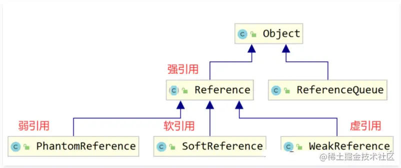 - 虚引用:一定回收,get出来就是null,引用形同虚设,主要和引用队列联合使用,在finalize之前会被放到引用队列中。