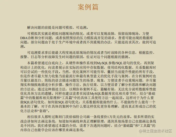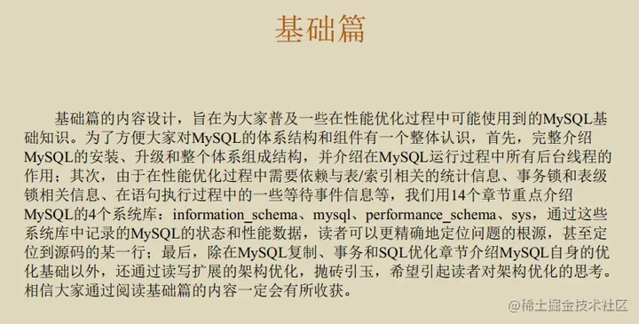 为解决这个实践难的问题,我想向大家推荐《MySQL性能优化金字塔法则》,此法则会从基础篇、案例篇、工具篇进行优化讲解,从工作中的应用场景出发,对相关概念和原理进行深度剖析,对MySQL性能优化进行全方位的总结和答疑,带你通过实战掌握MySQL调优技能!