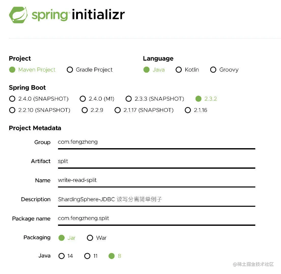 1、到 Spring Initializr(start.spring.io/) 上创建项目结构,选择 JDK 版本为 8,Spring Boot 为2.3.2(目前最新版本),并输入项目相关的信息。