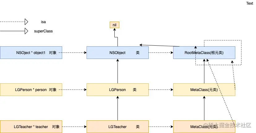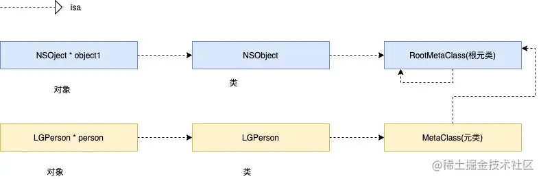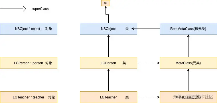 LgTeacher元类 继承 LgPerson元类,LgPerson 继承 根元类,根元类继承NSObject
