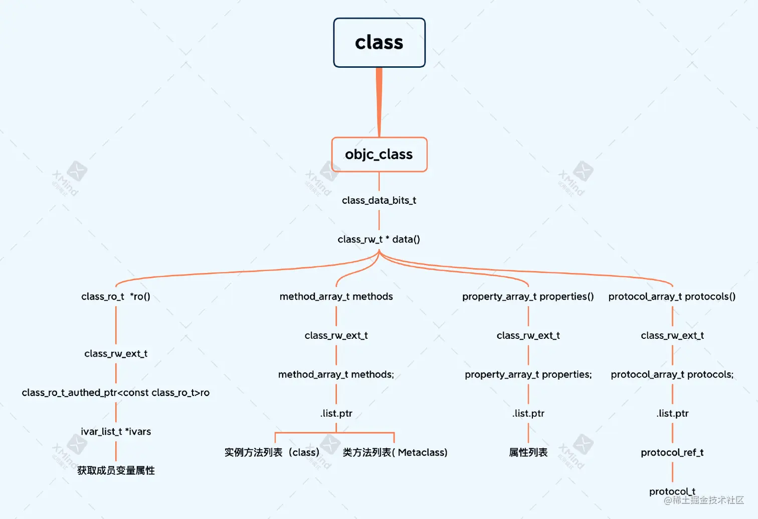 流程如下:NSObject.class->metaClass->class_data_bits_t->class_rw_t->method_arrat_t->method_list_t->method_t->big