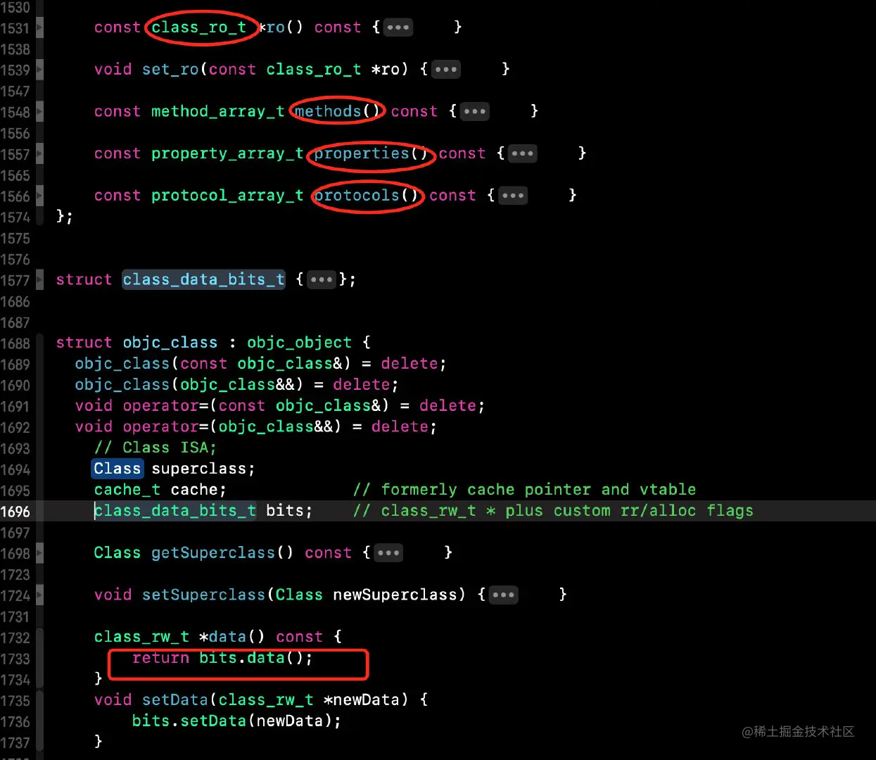 bits.data()应该存储数据,data()的类型是 class_rw_t.查看 class_rw_t的源码就是上面圈出来的.