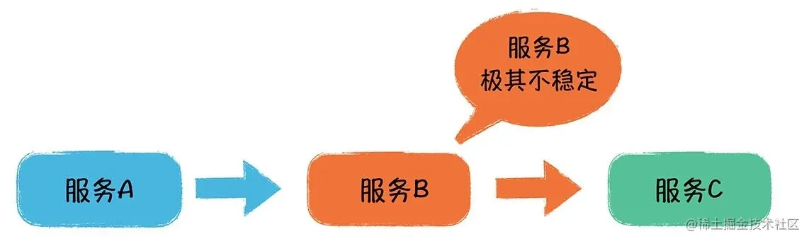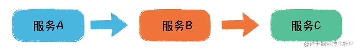 在实际产品开发过程中,某个服务或前端依赖一个服务接口,该接口可能依赖多个底层服务或模块,或第三方接口,比如说服务 A 依赖服务B,服务B又依赖服务 C,如下图所示: