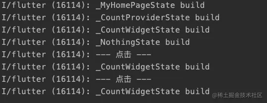 可以发现,每次我们点击 + ,调用 CountModel 进行 notifyListeners 更新时,都会导致 CountProvider 的子 Widget 全部刷新,不管是否依赖。