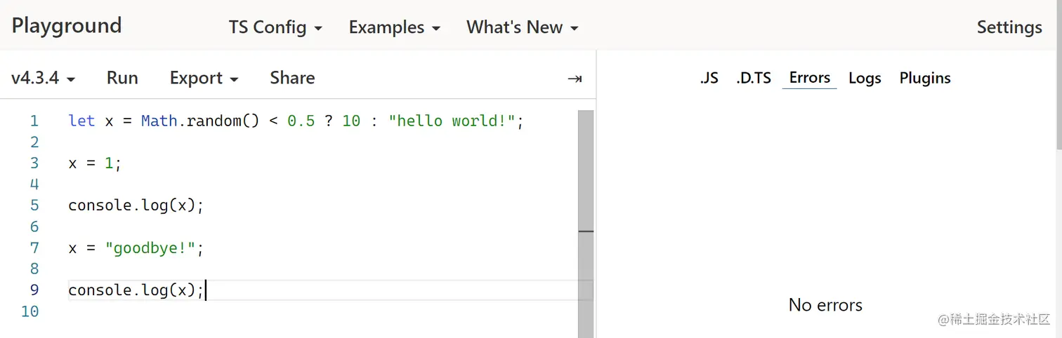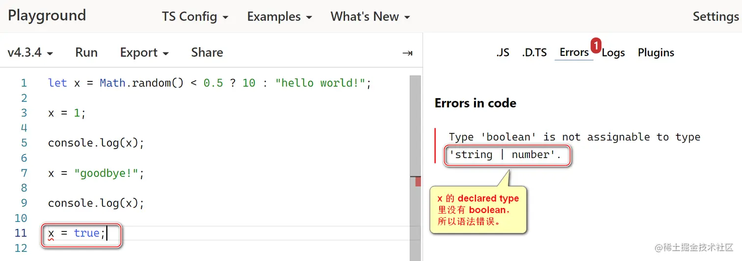 请注意,这些分配中的每一个都是有效的。 即使在我们第一次赋值后观察到的 x 类型变成了数字,我们仍然能够为 x 分配一个字符串。 这是因为 x 的声明类型(declared type) - x 开头的类型 - 是 string | number,并且始终根据声明的类型(declared type)检查可分配性。