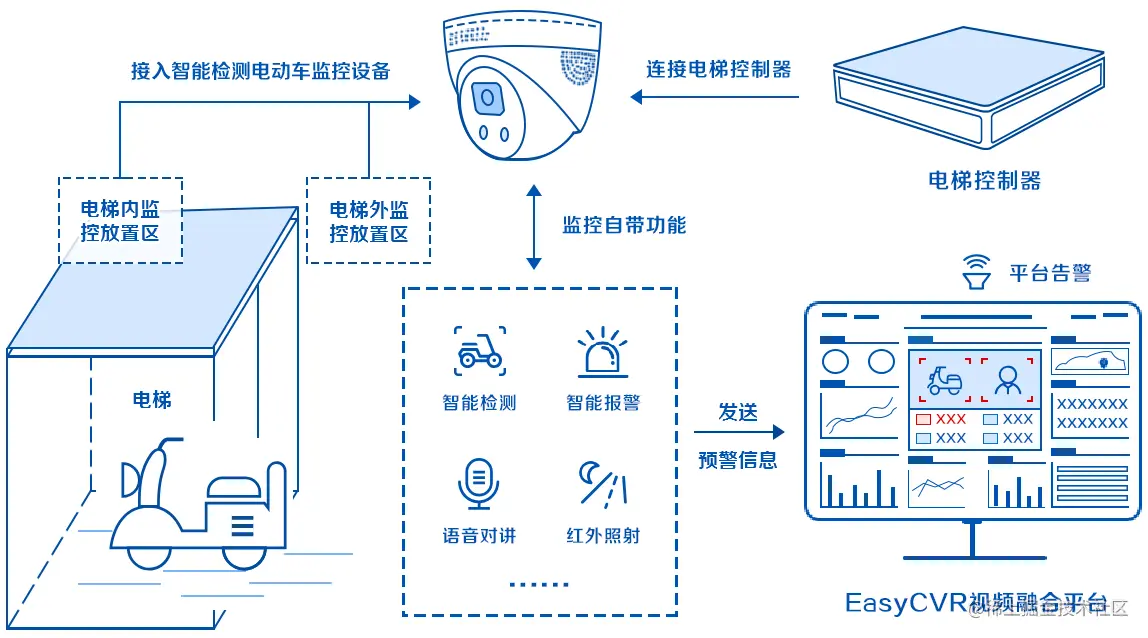 基于电梯内监控设备,智能检测与识别各类型的电动车,当检测到电动车进入电梯,摄像头可直接进行告警(声音/闪光),并自动将报警信息、现场图像、视频等数据上传至EasyCVR视频融合平台,管理人员可及时接收信息、查看现场情况,进行及时处理。彻底杜绝电动车进入电梯,并方便物业对小区进行管理,极大地减少电动车上楼导致的火灾事故。