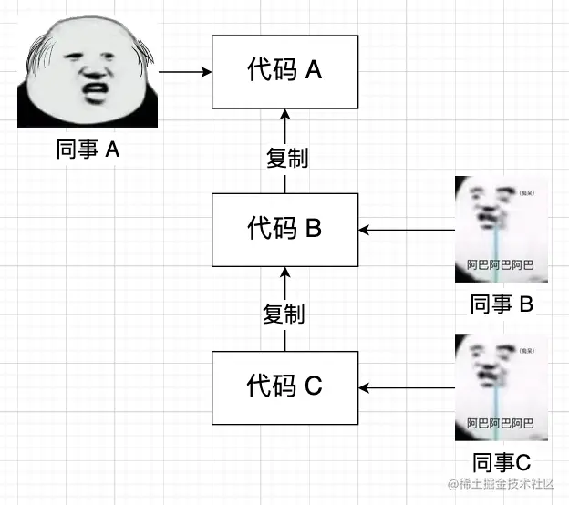 假如同事 A 写了一段代码,同事 B 和同事 C 都复制了他的代码:
