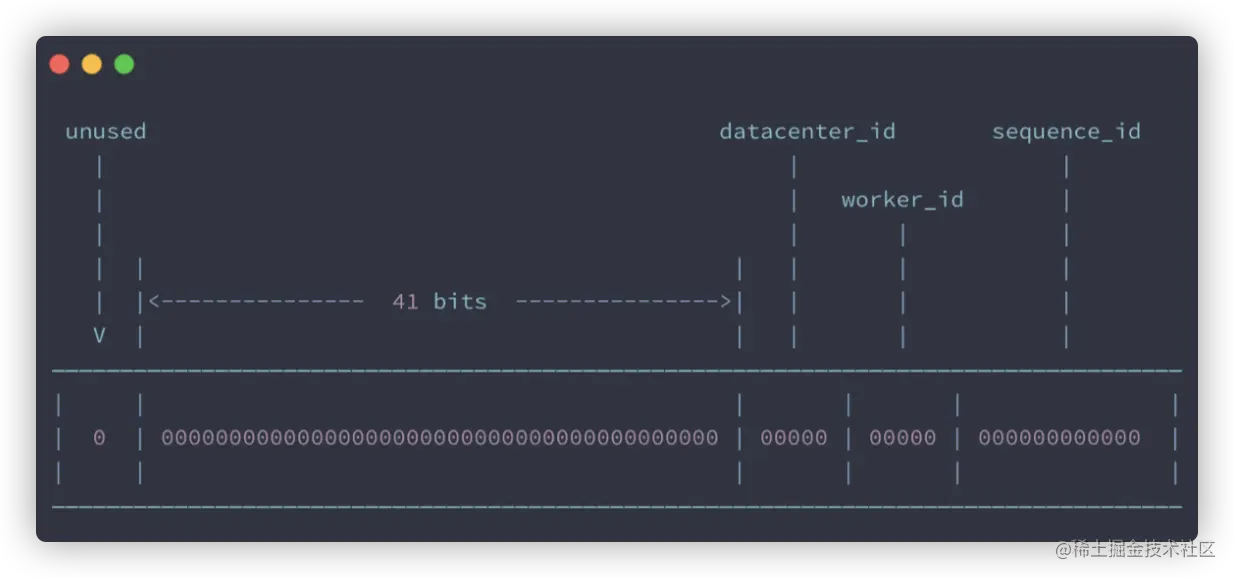 - 第 42~52 位 :一共 10 位,一般来说,前 5 位表示机房 ID,后 5 位表示机器 ID(实际项目中可以根据实际情况调整)。这样就可以区分不同集群/机房的节点。