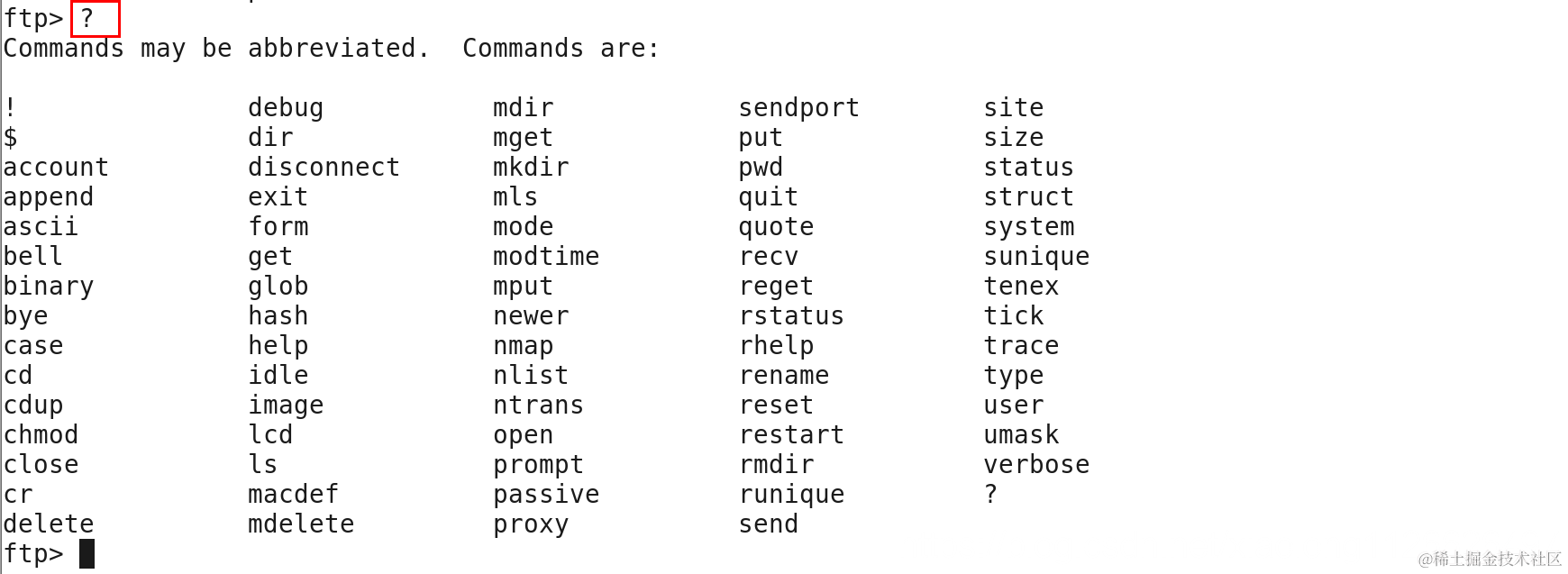进入FTP命令行之后,输入一个?号即可看当前命令行支持的功能命令。