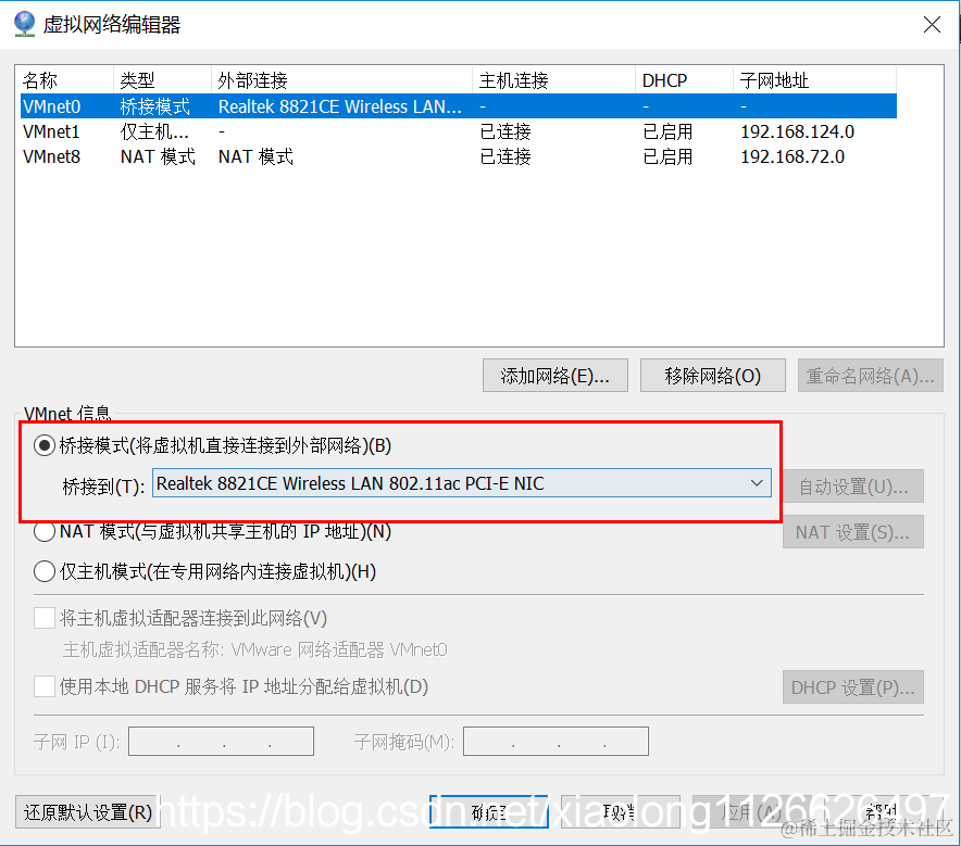那么在VM虚拟机里就设置桥接模式,桥接到WIFI网卡上。