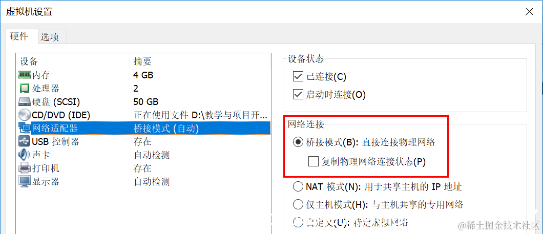 在虚拟机设置里也设置成桥接模式。