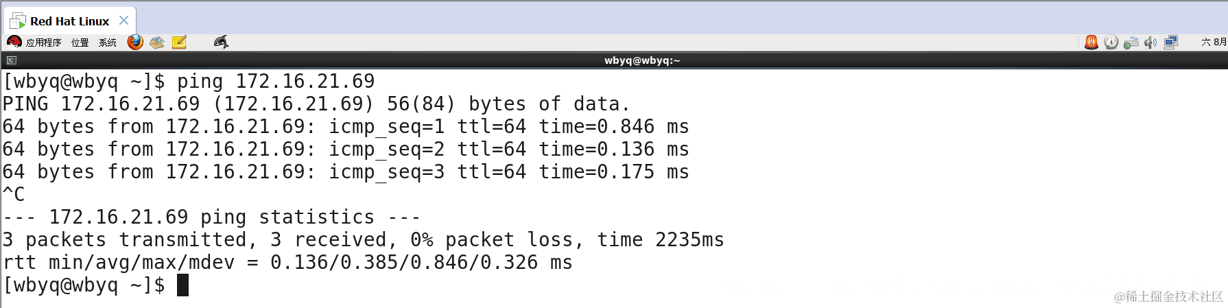 | [wbyq@wbyq ~]$ sudo ifconfig eth0 172.16.21.123 |