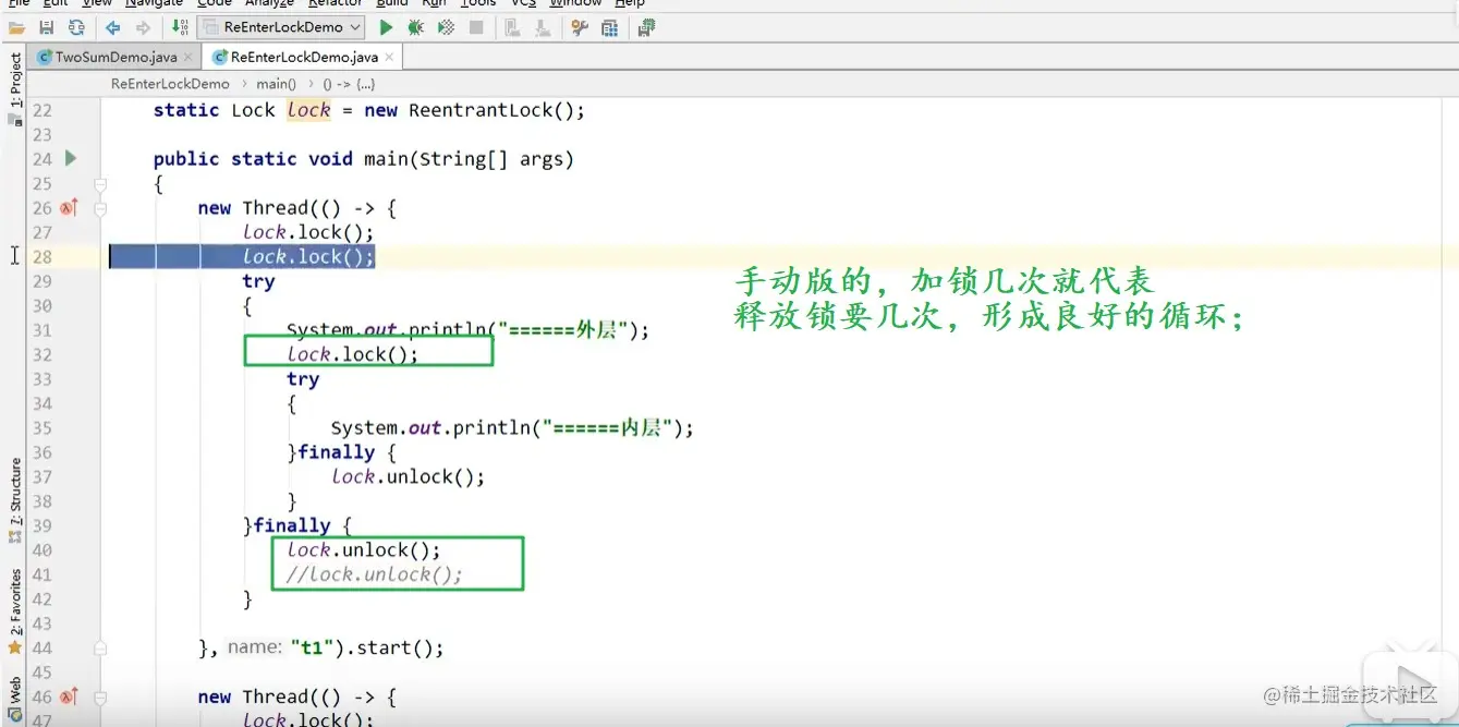 可重入锁--是指,同一个线程获取到外层的锁对象之后,如果内层方法中的锁对象和外层的一致,可自动进入的一个过程;(不会因为之前已经拥有锁未释放,就阻塞)