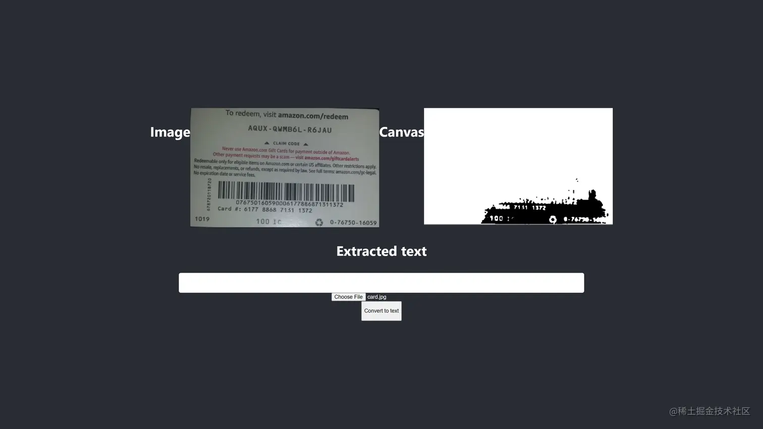 简而言之,使用Tesseract.js而不进行图像预处理,对上面的礼品卡产生了最佳结果。所有其他使用图像预处理的实验产生的结果都不太准确。