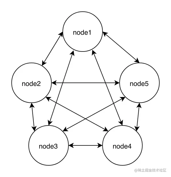 集群中每两个节点之间都需要互相同步状态,网络连接数是 n * (n - 1),在这里 n 的值是 5。