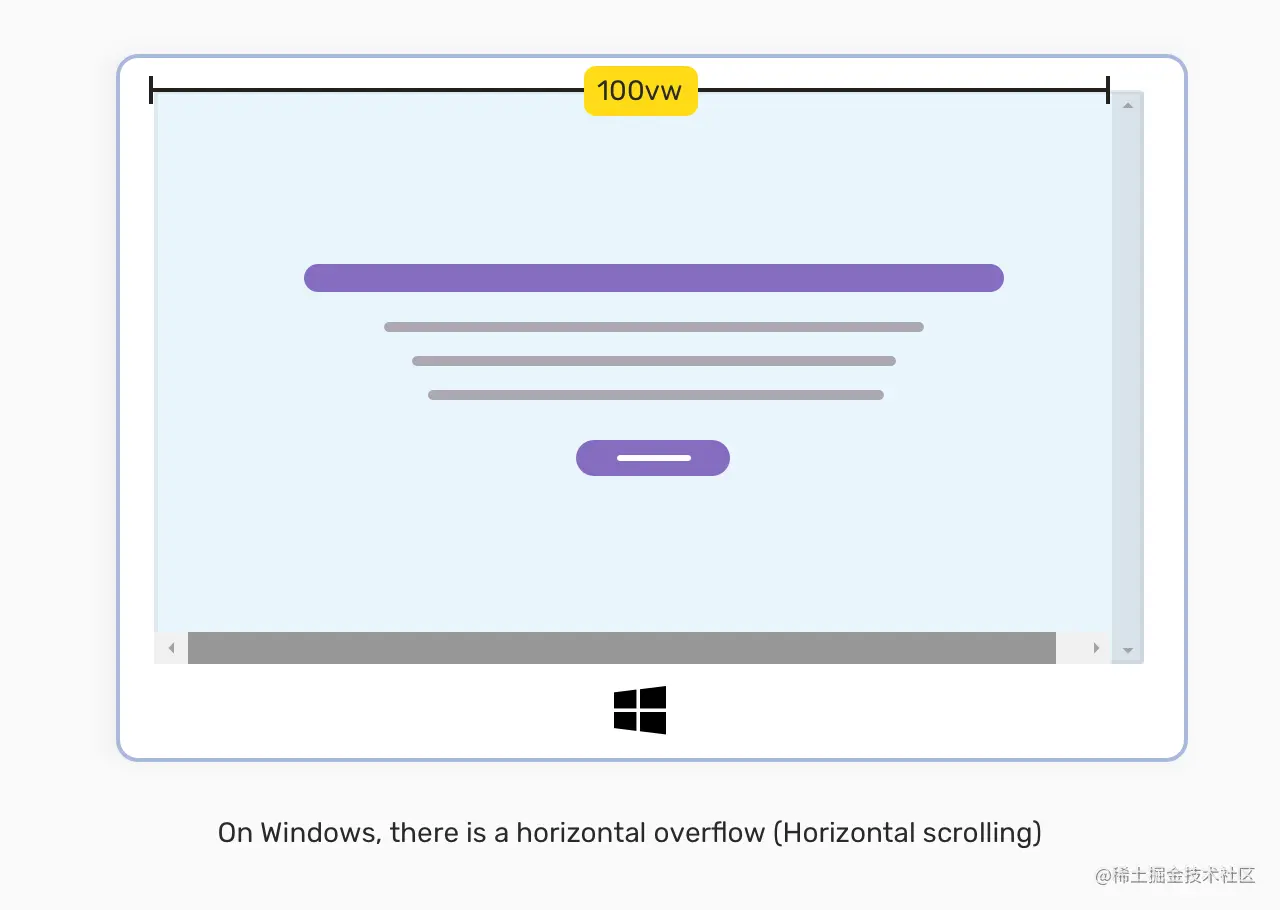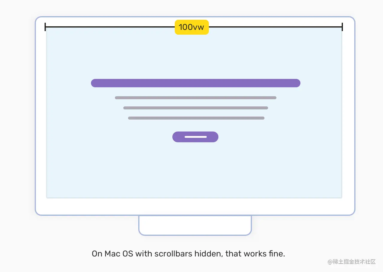使用100vw 确实有一个缺点,那就是当滚动条可见时,它可能导致溢出。在macOS上,100vw 是好的,不会导致水平滚动。