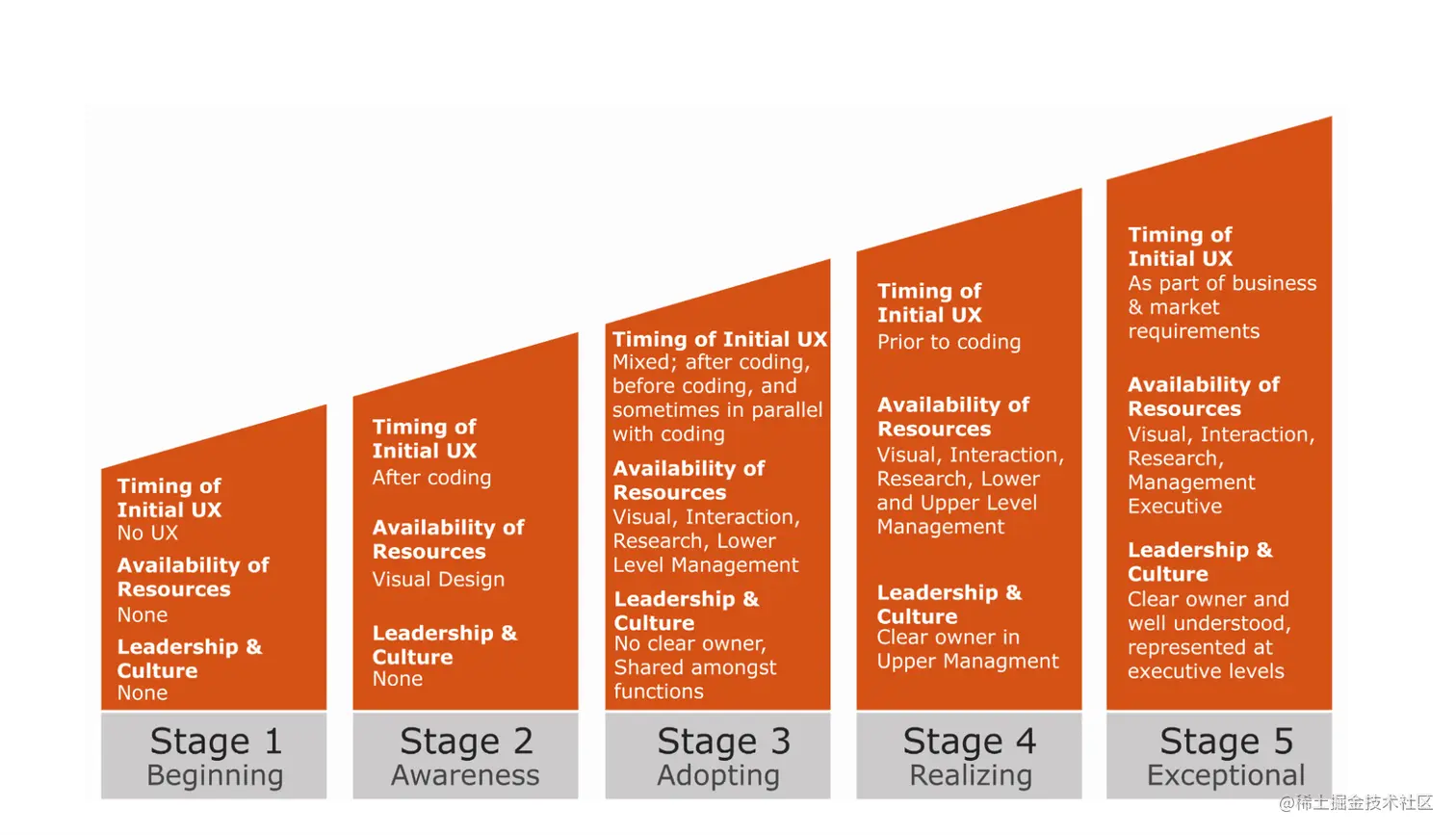 正如我在以前的文章中提到的,Chapman和Plewes的框架描述了组织用户体验成熟度的五个步骤或阶段,当我在提出的策略中提到用户体验成熟度阶段时,我参考了这些步骤。