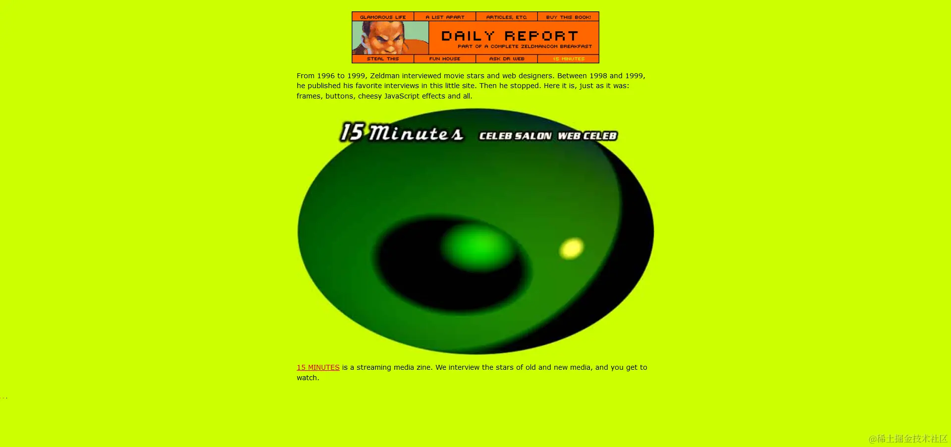 在一个不那么巨大的规模上,我对杰弗里-泽尔曼(Jeffrey Zeldman)对1995年的内容的保存只有尊敬和钦佩。见底部的 "请原谅我的档案 "部分。)整整26年的内容。现在有了一个经久不衰的网站。