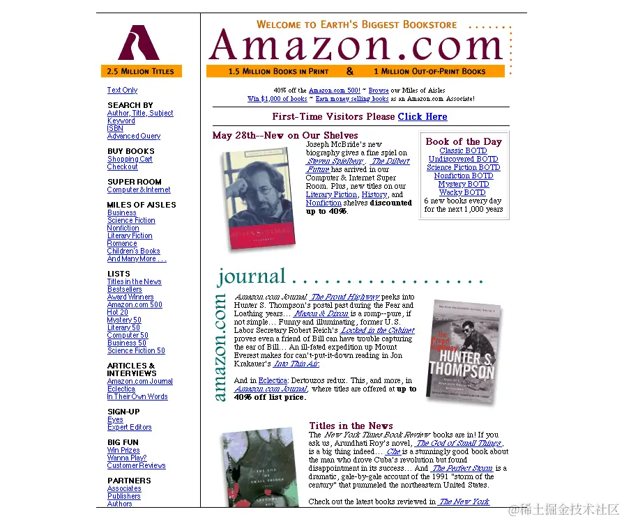 对于一个更加商业化的项目来说,我们很难超越亚马逊。版本博物馆的网站历史很吸引人。今天的亚马逊与1994年的亚马逊有很大的不同,但却有一种平稳的进化感。除了一些早期的磨合,没有任何设计上的变化让人感到刺耳。