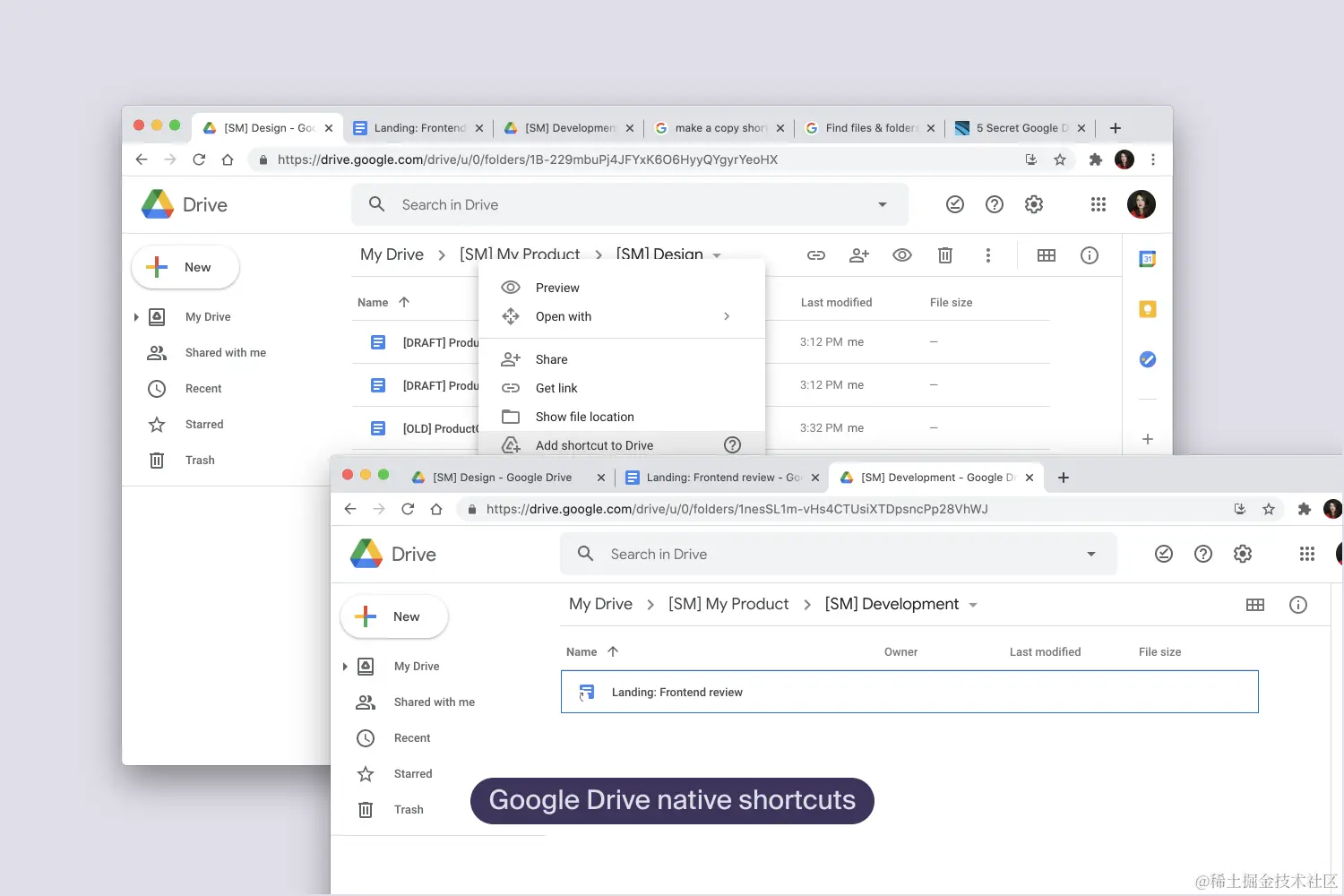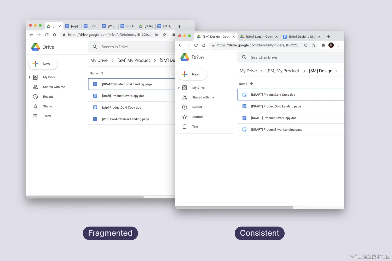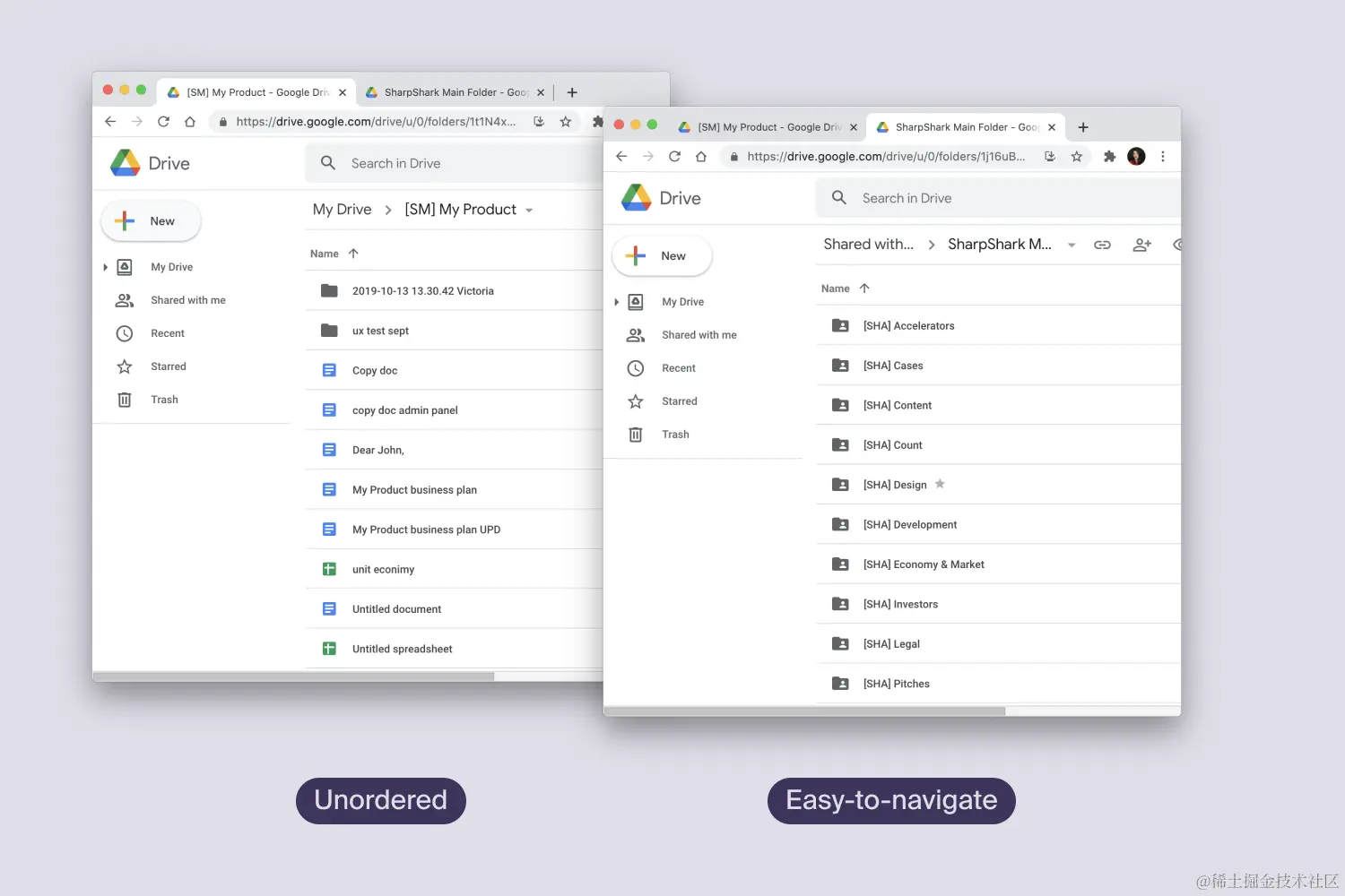 比较上面的两个文件夹。一个是在Google Drive中显示随机文件的文件夹,另一个是为你的所有资产提供一些跨文件夹的结构。当然,如果团队中的每个人都对他们的资产进行一致的命名和结构化,那么你会更容易找到,比如说,你给投资者的七月报告。