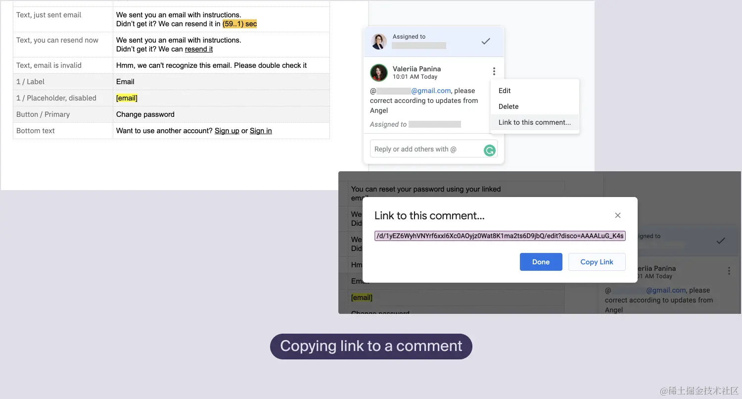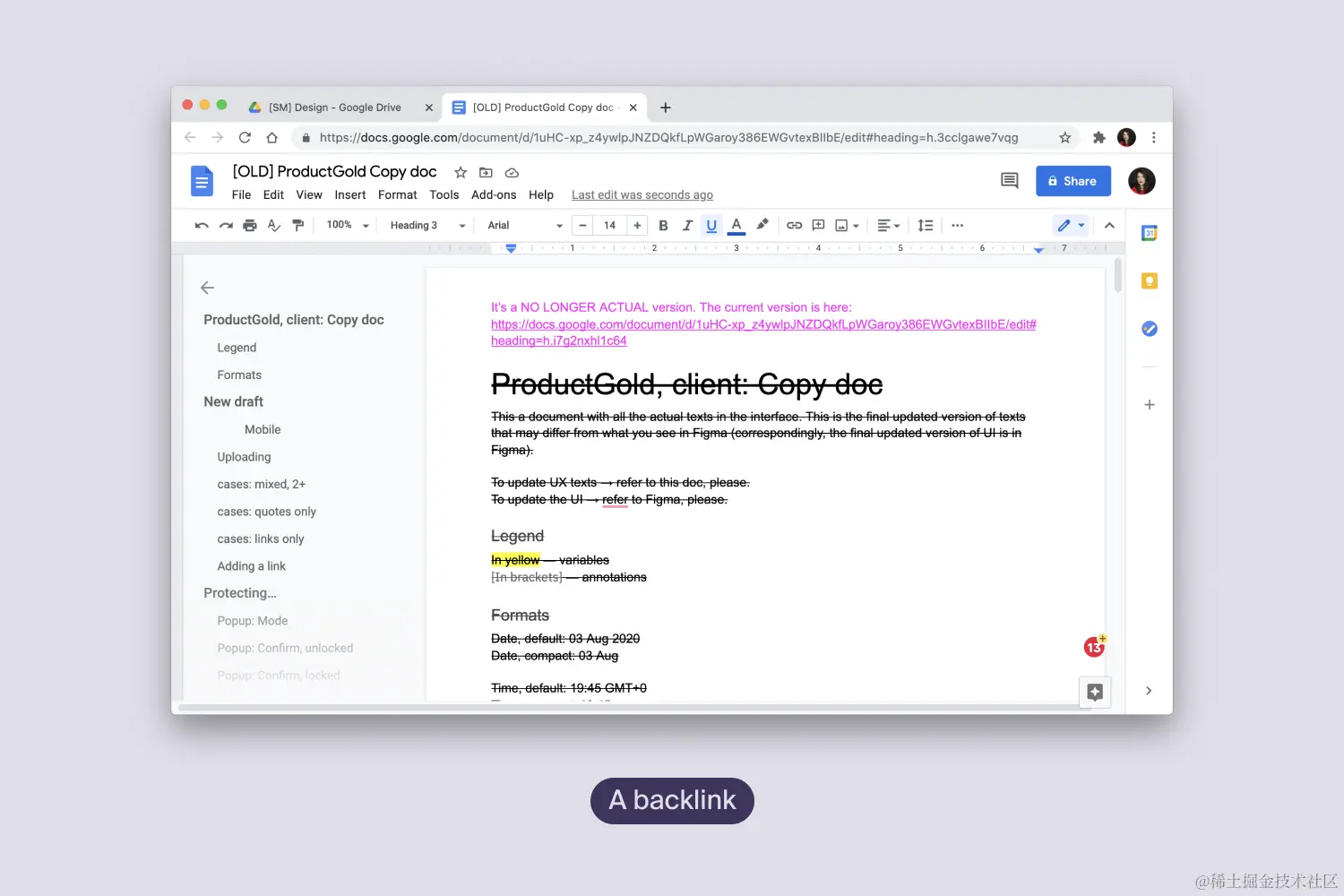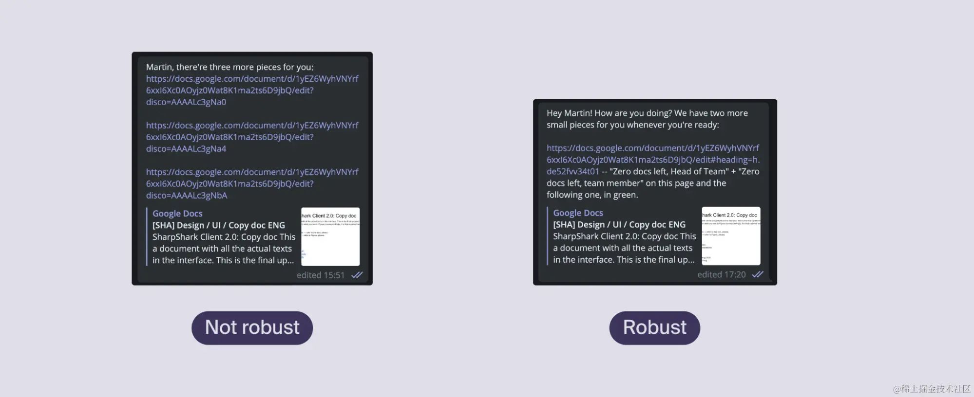 它们都是有用的功能,但请记住,与粘贴在文档或信息正文中的普通链接相比,这些元素并不那么强大。例如,如果你看下面的图片,在左边的信息中,我添加了Google Docs书签的链接,没有任何注释。如果书签消失了,这个人就会被重定向到页面的开头,并且不知道是什么地方的意思。