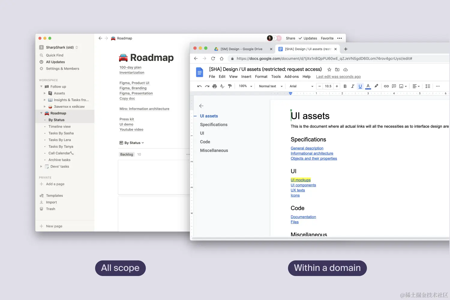 这同样适用于任何资产。特别是当你同时使用几种工具时。例如,如果你在Google文档中制作了一个产品资产的索引列表("首页"),那么就不要在Notion工作区中创建一个相应的链接列表,反之亦然。