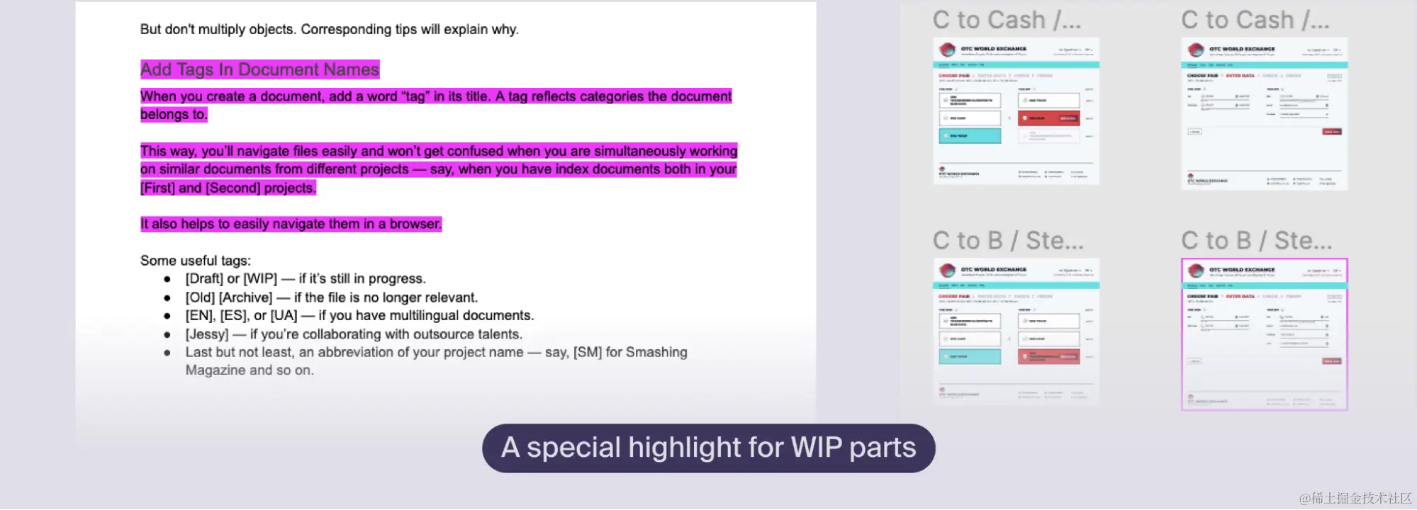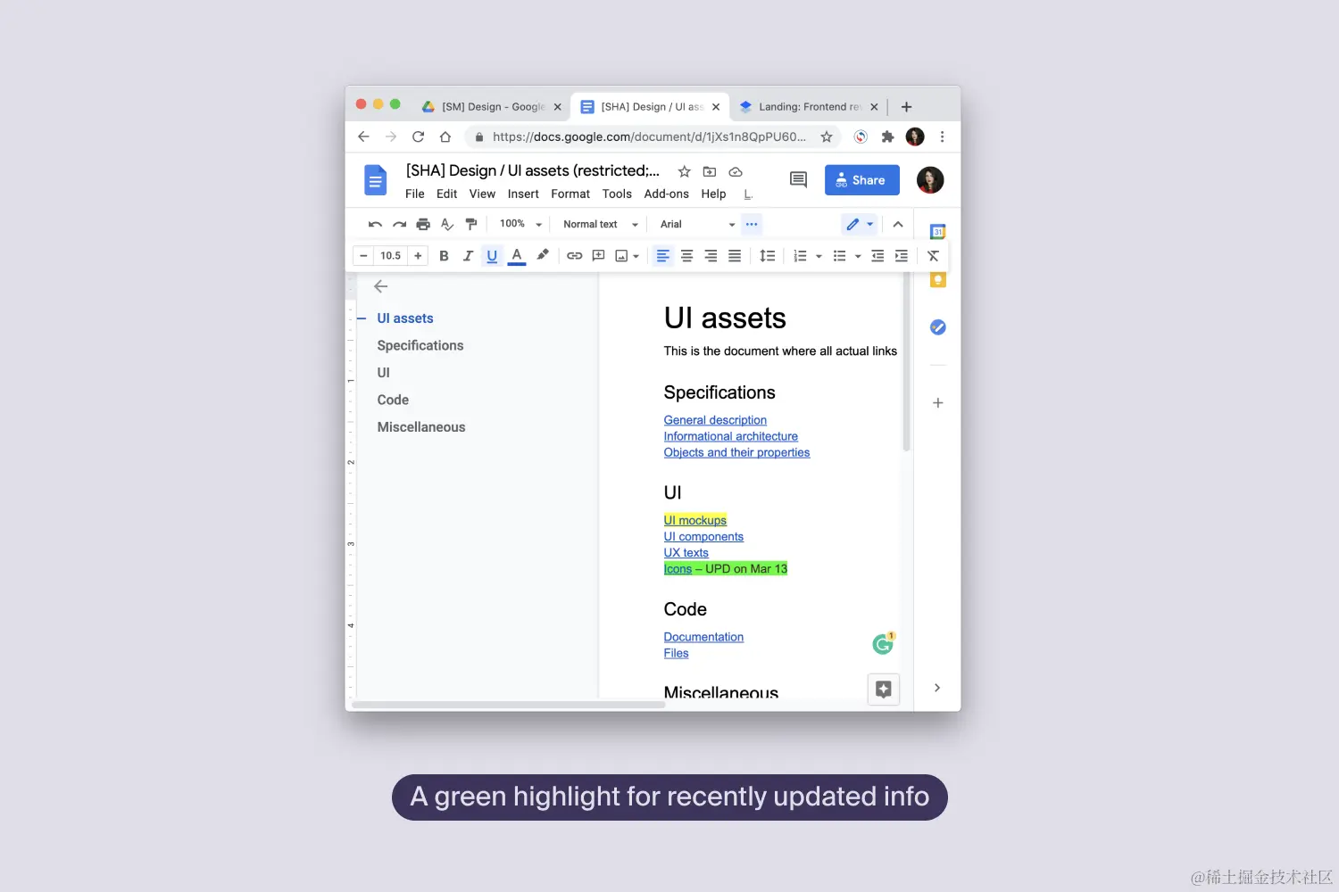 你也可以突出显示你目前正在工作的部分。当你在处理大文件,并且有几个未完成的、分散的大块时,这特别有帮助。这样,你就可以减少错过一些未完成的部分的机会,因为你在修改文件时可以发现它们。它实际上适用于所有类型的文件--从Google Docs文章到Figma板。