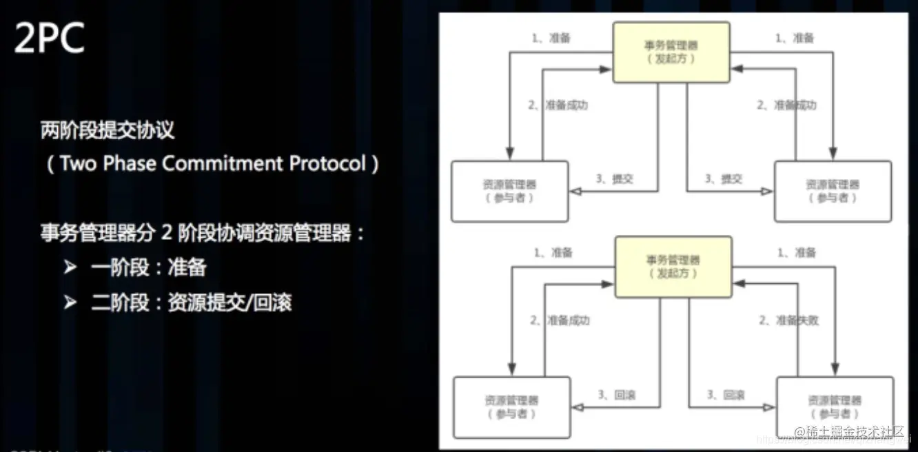 两阶段型2PC:就是分布式事务两阶段提交,对应技术上的 XA、JTA/JTS。这是分布式环境下事务处理的典型模式。