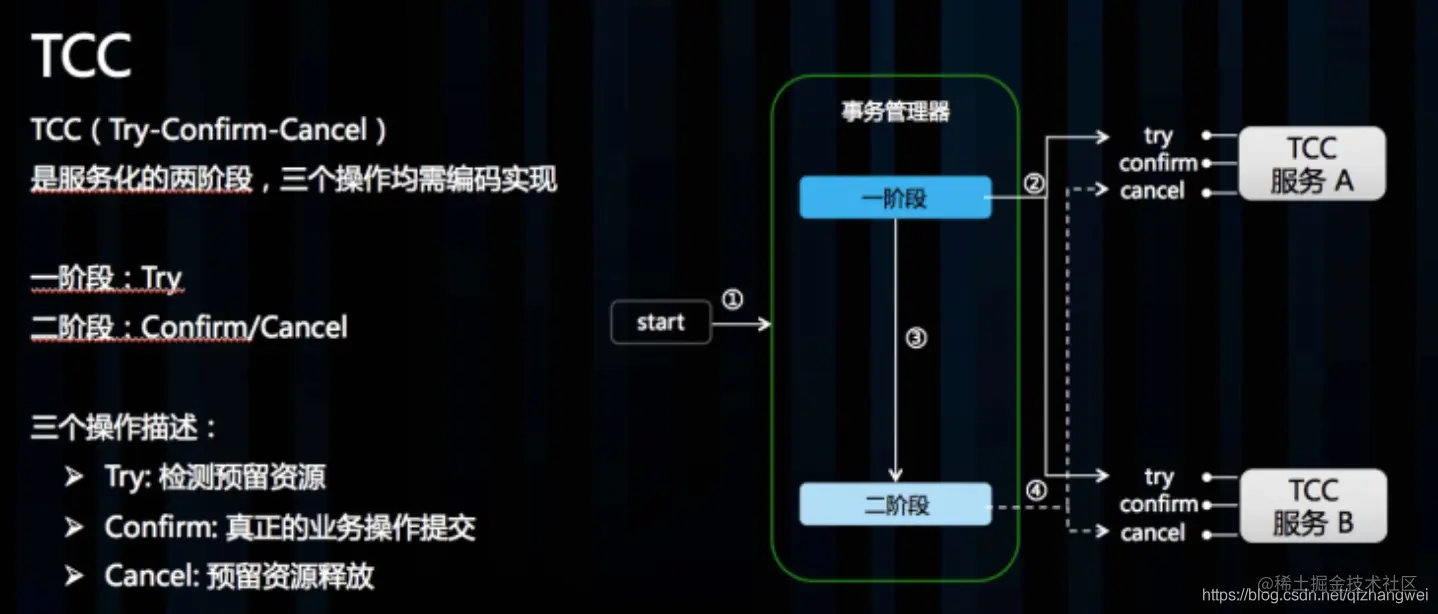 补偿型:TCC 型事务(Try/Confirm/Cancel)可以归为补偿型。TCC(Try-Confirm-Cancel) 实际上是服务化的两阶段提交协议,业务开发者需要实现这三个服务接口,第一阶段服务由业务代码编排来调用 Try 接口进行资源预留,所有参与者的 Try 接口都成功了,事务管理器会提交事务,并调用每个参与者的 Confirm 接口真正提交业务操作,否则调用每个参与者的 Cancel 接口回滚事务。
