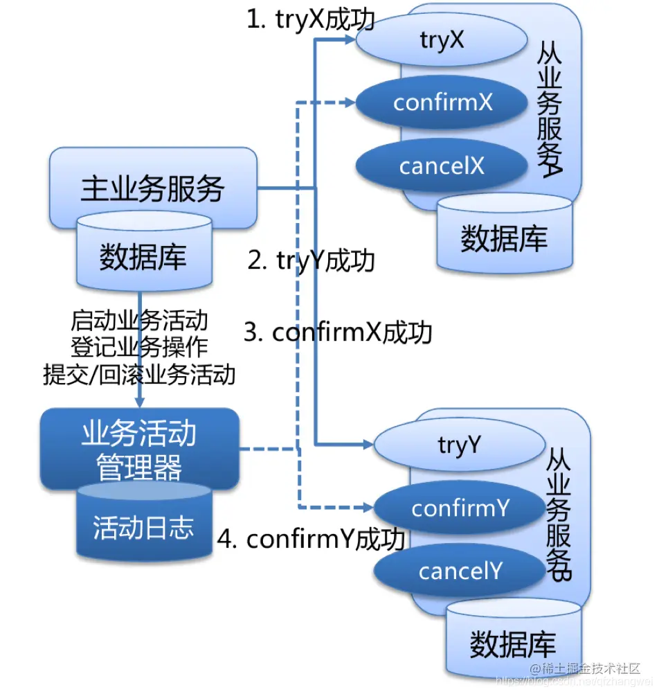 - 分布式事务执行过程中,依次执行各参与者的正向操作,如果所有正向操作均执行成功,那么分布式事务提交。如果任何一个正向操作执行失败,那么分布式事务会退回去执行前面各参与者的逆向回滚操作,回滚已提交的参与者,使分布式事务回到初始状态。