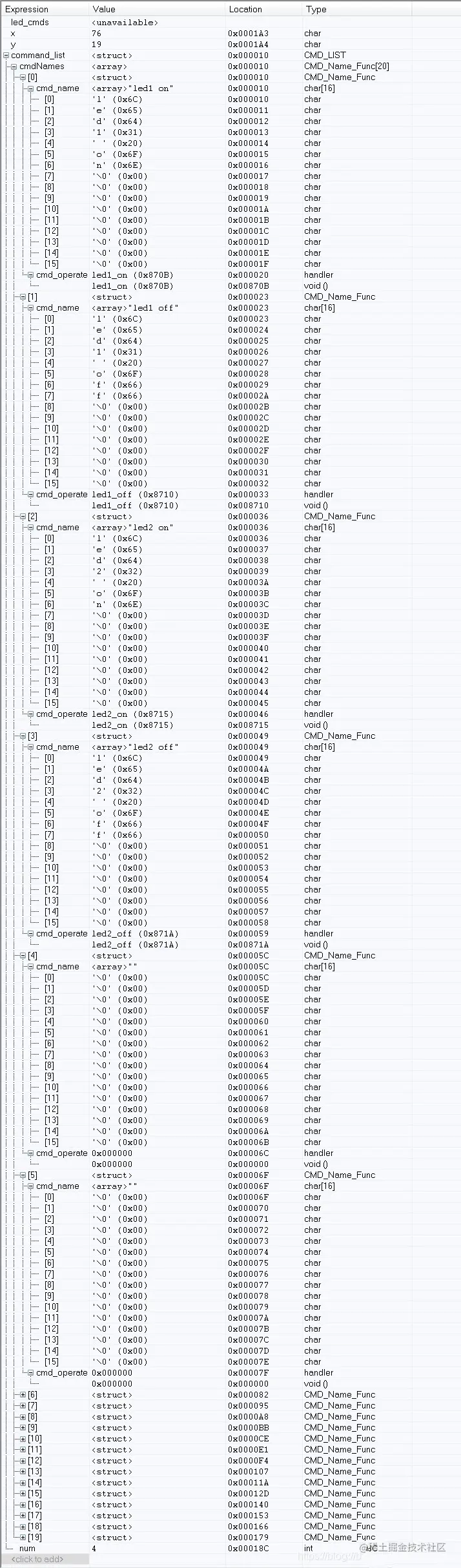 这个是新建了4个led命令结构体,可以看出来每个命令的字符串数组长度都是16,函数指针默认为int型,占两个字节。一个结构体总共占18个字节。 4个led命令占4*18=72个字节的空间。虽然led命令最长的字符串只占8个字节,但是系统依然会分配16个字节空间。