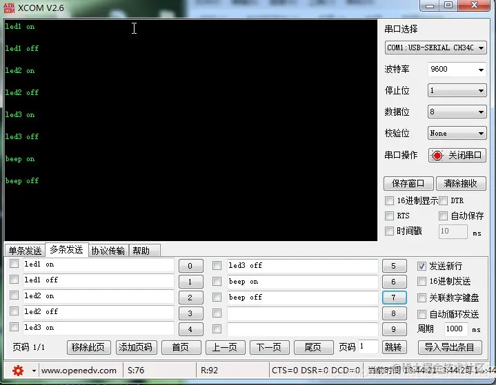 这样通过字符串命令就可以直接控制LED灯和蜂鸣器了,如果下次需要增加一个继电器控制模块,就只需要编写继电器模块的c代码,在进入main函数时,注册继电器命令。继电器的模块就会被添加进来了。而不需要修改其他的模块和串口任何代码。