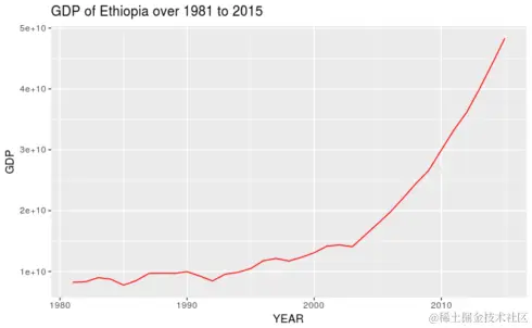 让我们看一下使用ggplot2包的GDP与时间的分散图
