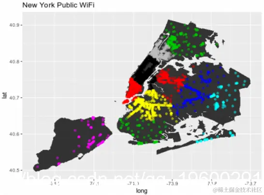 color = newyorkdf $ fit.cluster,alpha = .5)+ ggtitle(“纽约公共WiFi”)