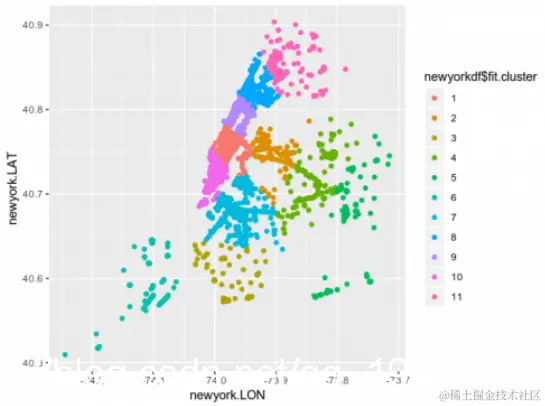ggplot(newyorkdf,aes(x = newyork.LON,y = newyork.LAT,color = newyorkdf $ fit.cluster))+ geom_point()