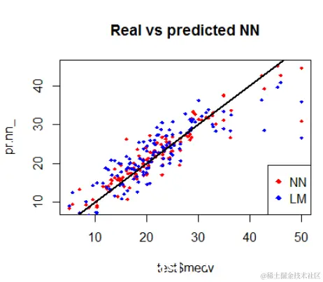 通过检查图,我们可以看到神经网络的预测(通常)在直线周围更加集中(与线完美对齐将表明MSE为0,因此是理想的完美预测)。