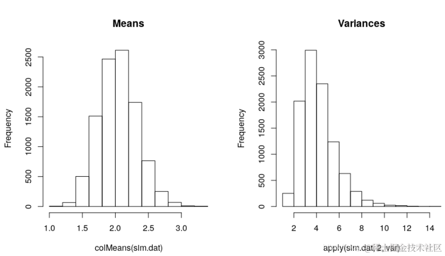 c(mean(colMeans(sim.dat)), mean(apply(sim.dat, 2, var)))#10,000个模拟结果的平均值和变量的平均值