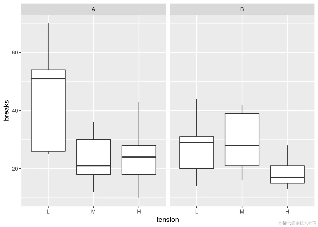 我们想确定一种类型的羊毛在不同程度的紧张情况下是否优于另一种羊毛。为了研究我们是否可以找到一些差异的证据,让我们来看看数据: