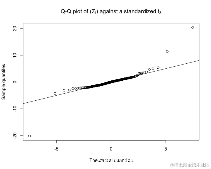 我们考虑使用t 分布的ARMA(1,1)-GARCH(1,1)过程。