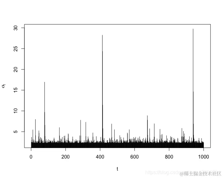 plot(sig, type = "h", xlab = "t", ylab = expression(sigma[t]))