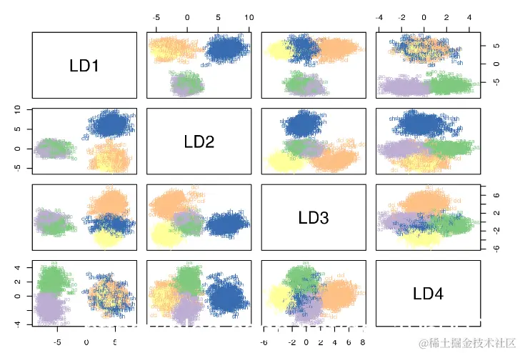 我们还可以使用plot.lda函数绘制训练数据到所有判别变量对的映射,其中dimen参数可用于指定所考虑的维数: