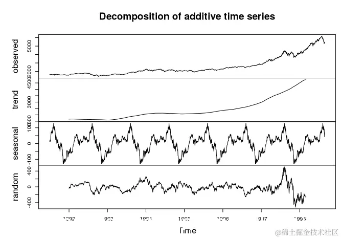 daxData <- EuStockMarkets[, 1] #数据似乎不是可乘的,请使用加法分解