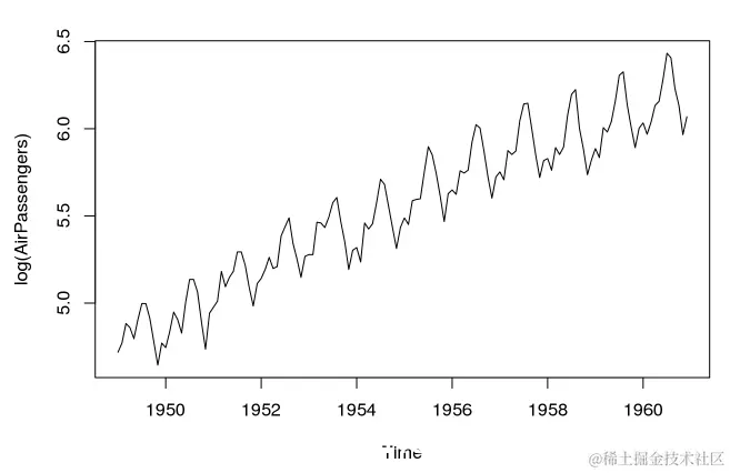 正如我们所看到的,采用对数已经使季节性成分的变化均衡。请注意,总体增长趋势没有改变。