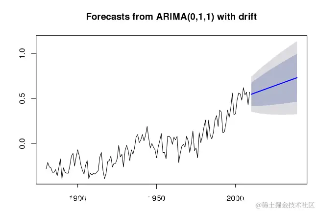 为了演示ARIMA模型对非平稳数据的使用,我们将使用数据集astsa。该数据集提供全球平均陆地 - 海洋温度偏差的年度测量值。