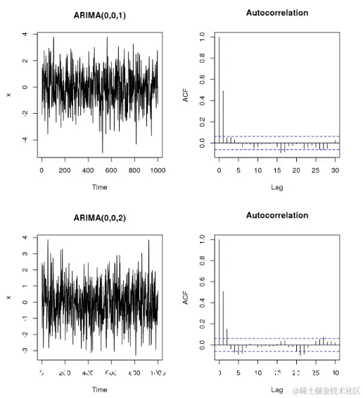 请注意,对于自回归图,我们需要注意第一个x轴位置表示滞后为0(即标识向量)。在第一个图中,只有第一个滞后的自相关是显着的,而第二个图表明前两个滞后的自相关是显着的。为了找到MA的阶数,适用与AR类似的规则:MA的阶数对应于自相关显着的最大滞后期。